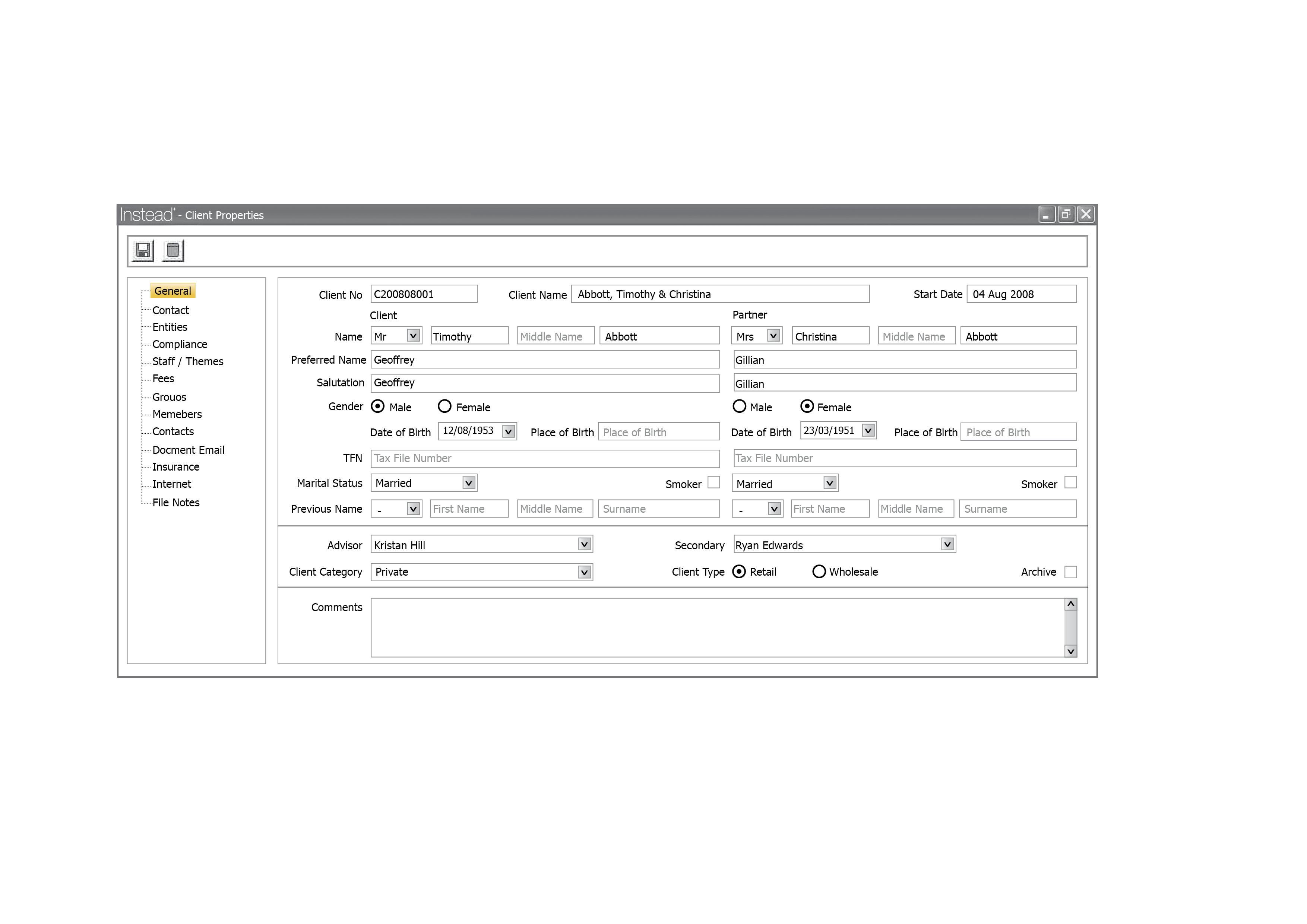 The Instead Client module links clients to their related entities, provides a comprehensive data collection tool, and manages clients' insurances.